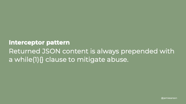 Returned JSON content is always prepended with a while(1){} clause to mitigate abuse.